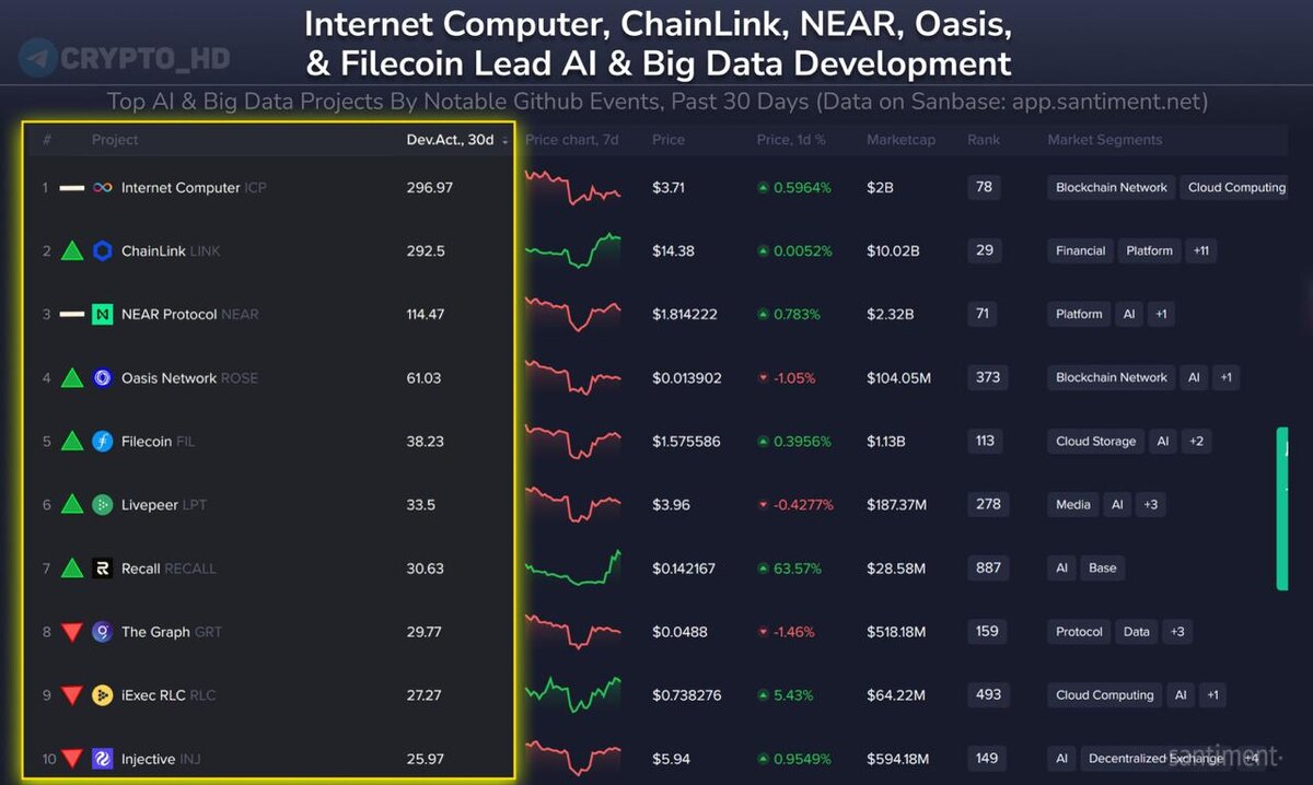 #ончейн #рейтинг 📊 Santiment: ТОП-10 криптопроектов в сферах AI и Big Data по активности разработчиков. 1. Internet Computer #ICP 2. Chainlink #LINK 3. NEAR Protocol #NEAR 4. Oasis Network #ROSE 5. Filecoin #FIL 6. Livepeer #LPT 7. Recall #RECALL 8. The Graph #GRT 9. iExec RLC #RLC 10. Injective #INJ Ранее: прошлый топ Crypto Headlines