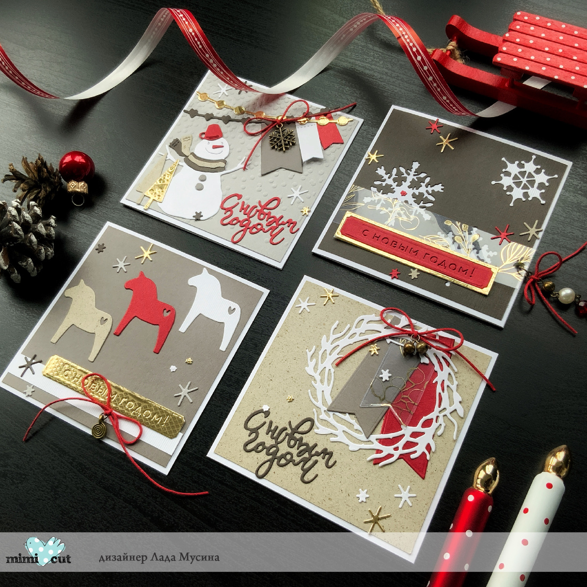 Привет-привет, с вами снова Лада Мусина. Рецепт моих быстрых новогодних открыток - никакой скрапбумаги, только плотный дизкартон в праздничной палитре, металлические подвески и вырубка ножами Мимикат. Любимый формат 10х10, традиционные зимние истории, блеск перламутра и золота - остановиться практически невозможно! В работе над открытками использовала зимне-новогодние ножи на любой вкус: «Снеговик», «Сплету венок, «Бусы повесили», «Снегопад», «Автомобиль с подарками», папку «Конфетти», а также тематические ножи с надписями «Мои поздравления», «Телеграфируйте», «Слова для души». И конечно, я не забыла и символ наступающего года. Лошадки обнаружились в наборе ножей «Хюгге». Всем яркой зимы, мира и добра!