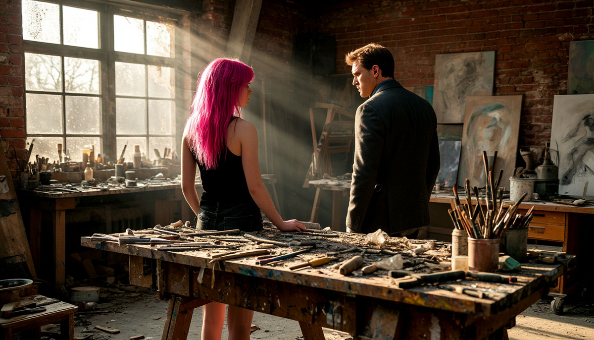 Я вошёл. И снова был атакован. Но теперь не цветом и светом, а самой материей творчества. Повсюду — груды «мусора», который в её глазах был сокровищем: старые рамы, ящики, куски ржавого железа, горы битой плитки. В центре, под лампой, она что-то собирала из проволоки и куска разбитого зеркала. В полумраке её розовые волосы казались неоновым пятном.