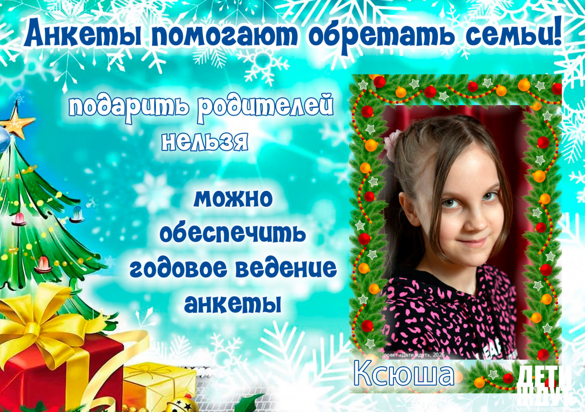 Друзья, на Дети-ждут.рф слишком много детей, которые должны жить в семьях, но пока живут в детских домах. В предновогодние дни всем нам так хочется согреть ребят своим теплом, сделать что-то для них! Каждый из нас может сделать самый важный подарок для ребенка, оставшегося без родителей — подарить возможность поскорее найти семью. Уже много детей обрели семьи, благодаря размещению информации о них в интернете. Фонд «Дети ждут» создает и ведет анкеты детей, по которым их находят будущие родители. В нашей базе есть анкеты, которые никто пока не поддерживает... Ксюше 12 лет, очаровательная, добрая и энергичная девочка. В школе Ксюша демонстрирует удивительную целеустремлённость и жажду знаний. Увлечена рукоделием, конструирует из бумаги, лепит, создаёт яркие аппликации. Она доброжелательная, позитивная, окружена множеством друзей, всегда готова первой прийти на помощь. Занимается в кружке по вокалу и шитьём народных кукол. 🌸 Анкета Ксюши на дети-ждут.рф Если вы хотите стать незримым анг