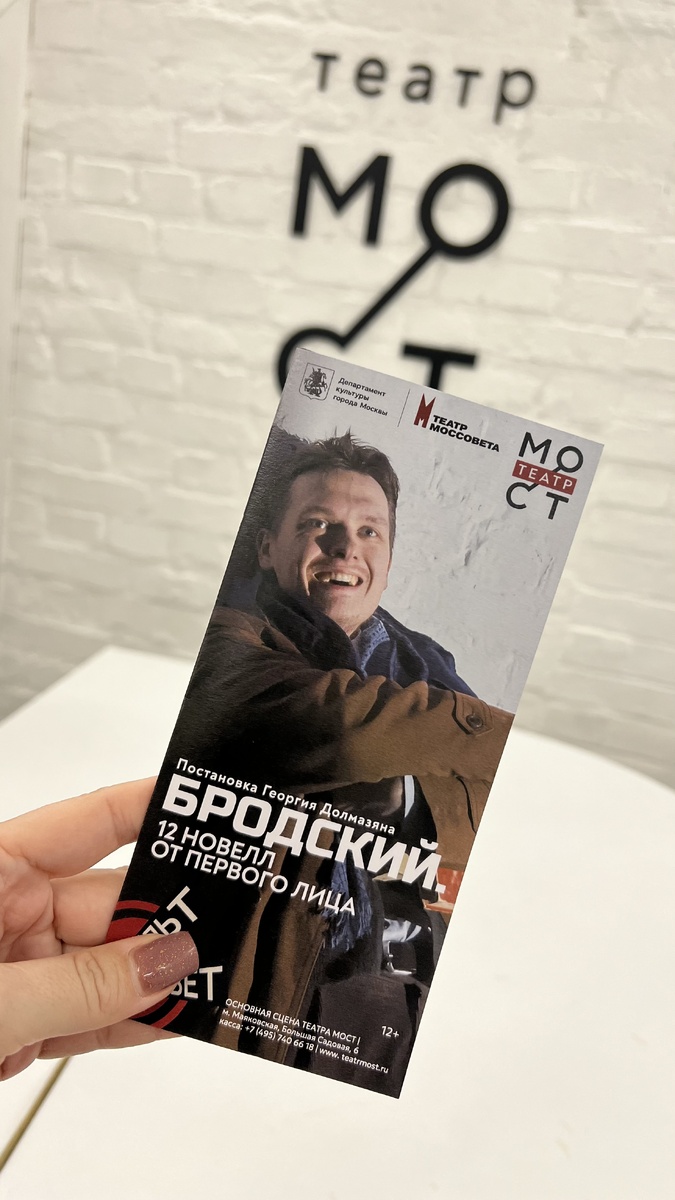 Премьера в театре «Мост»❤️ «Бродский. 12 новелл от первого лица» от режиссера Георгия Долмазяна. Браво 👏🏻👏🏻👏🏻 Иван Орехов (Бродский) смог перевоплотиться в поэта-изгнанника так, что стал похож на него! На небольшой сцене театра за час прошуршали страницы жизни: жизни на чужбине и жизни в 1,5 комнатах Ленинградской коммуналки. Лекции о великих русских (Ахматова, Цветаева, Достоевский) в Энн-Арборе лишь на миг приближали его сердце к ушедшему родному порогу… Мама, папа… (Людмила Давыдова и Всеволод Гусейнов). Всплывают трогательными образами-всполохами… Как ангелы они кружат по своим маленьким квадратным метрам, декламируют стихи сына, его удивительный рождественский цикл! Спектакль был создан в честь 85 годовщины писателя и продолжил прекрасный образовательный проект «Культпросвет», который я считаю эталонным примером просвещения! Школьники не уснут, учителя будут счастливы). Можно всей семьёй, можно «окультурить» девушку или парня)) Местоположение у театра идеальное