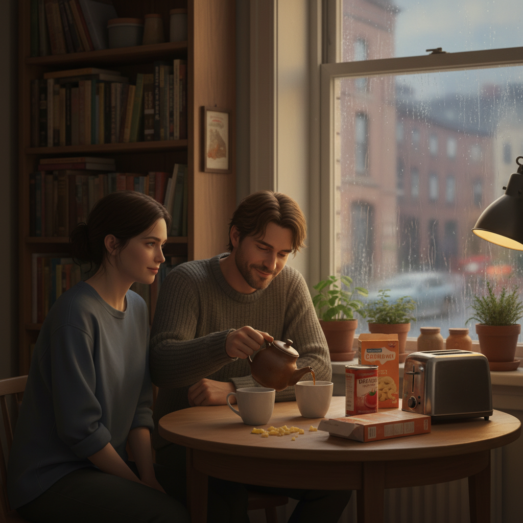 Они встретились, когда им было слегка за тридцать, когда уже перестали ждать. Марк стоял в отделе бытовой химии, выбирая средство для мытья посуды, и смотрел на четыре флакона с одинаковой растерянностью. Лилия искала ту самую кашу, которую ела в детстве у бабушки, и уже пятнадцать минут водила пальцем по полкам в отделе для диабетиков. — Простите, вы не знаете, где тут… — начала она, поднимая глаза. — Нет, — слишком быстро ответил он, поняв, что она приняла его за работника магазина в его темном свитере. — То есть, я тоже покупатель. Просто стою. Она кивнула, и они разошлись. Но через десять минут столкнулись у кассы — в соседних очередях. Он заметил, что она кладет в сумку кашу, которую искала, и одну грушу. У него в корзине были макароны, томатная паста и средство для посуды. Дождь застал их у выхода. Он открыл зонт — большой, черный, старомодный. — Провести? — спросил он, и в его голосе прозвучала неловкая формальность, будто он навязывается. — Спасибо, — просто сказала она. Они