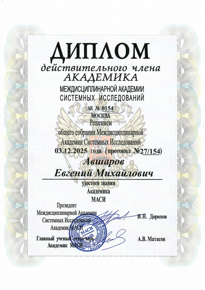 С уважением, Президент МАСИ И.Н.Дорохов. " 03.12.2025г. Диплом в формате PDF смотреть по ссылке - http://www.course-as.ru/AEM_GE/AEM_МАСИ.pdf Приятно когда твой труд оценивают сторонние организации, без контактирования с автором! Выражаю свою глубокую признательность за высокую оценку моих трудов в области экспериментальных измерений излучений неэлектромагнитного характера с помощью "Эфиродинамических Измерителей Авшарова", и с присвоением мне звания Академика "МАСИ"!