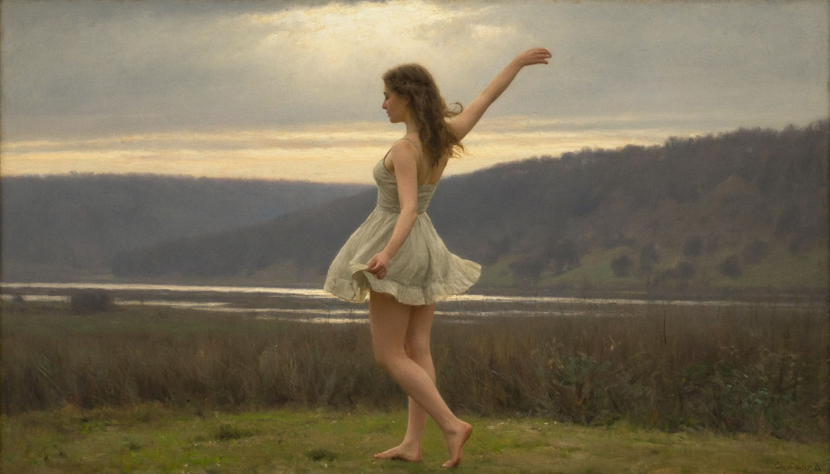 Девушки в коротком платье танцуют, почти на фоне картин Саврасова 20 мгновений