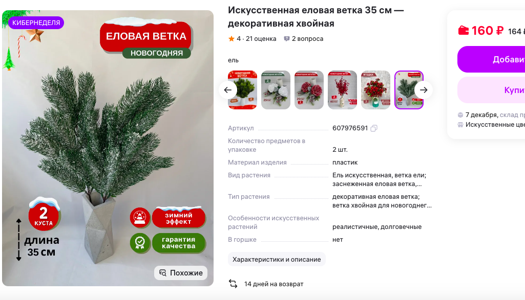 Искусственная еловая ветка 35 см — декоративная хвойная (WB, арт 607976591)