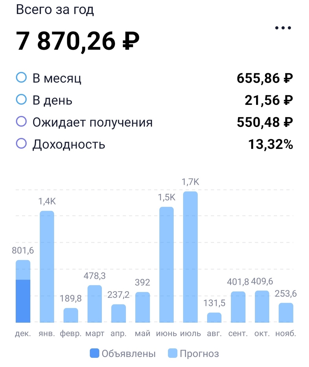 Начался декабрь, и прогноз по пенсионному портфелю родителей немного обновился: Так всегда бывает при смене месяца, ведь проявляется амортизация/погашение облигаций, и не учитывается реинвестирование средств. С прошлого пополнения портфеля прошло совсем немного времени, я за это время успела поговорить с родителями, и мы пришли к выводу, что идеальный среднемесячный пассивный доход через десять лет был бы примерно равен трём их квартплатам или 615 литрам АИ-95. В этом случае я смогу часть денег отправлять на реинвестирование, и проблем не будет. Текущие выплаты могут обеспечить всего 10 литров топлива. Даже если к целевым значениям я приду позже 2035 года, стремиться есть к чему. Неожиданно для себя, я собрала достаточную сумму для пополнения всего за неделю. И 5000 рублей отправила на брокерский счёт. Мои покупки Напомню, что я покупаю активы в соответствии со своими целями и знаниями, и мои заметки не являются ИИР. Помимо внесённых денег, ещё более 500 рублей пришло купонами. Пр