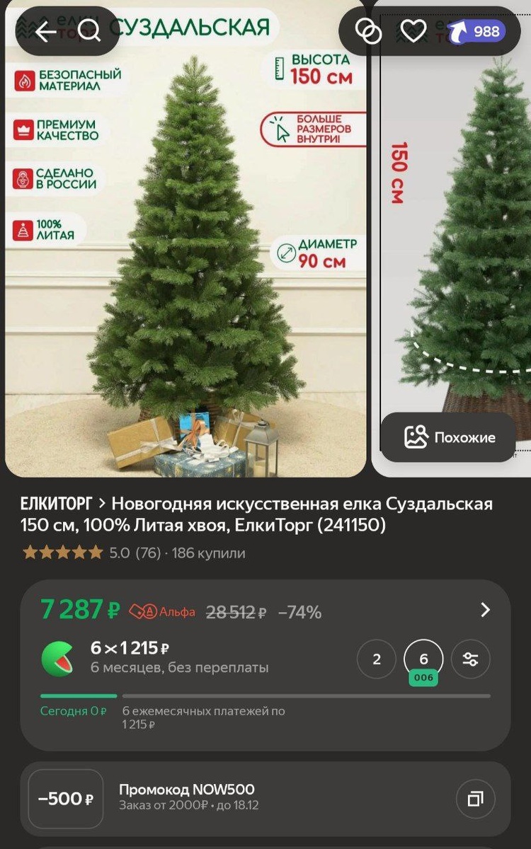 Новогодняя искусственная елка Суздальская 150 см, 100% Литая хвоя, ЕлкиТорг (241150) за 7287₽ https://market.yandex.ru/cc/89jp95