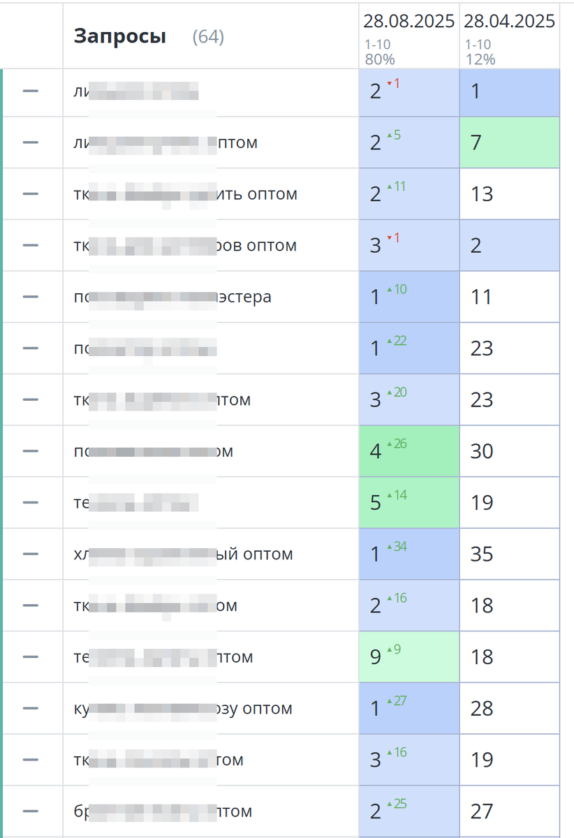 - ~25% — обычный рост, но без вау-эффекта: позиции подросли, но либо эффект оказался слабее ожиданий, либо его сложно отделить от параллельных работ по SEO.