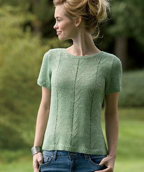 Простая летняя футболка с коротким рукавчиком. Вяжется по стандартной выкройке. Все планки выполнены мелким жемчужным узором, в котором смена петель идет в лицевых и изнаночных рядах. Мне бы хотелось остановиться на узоре. Он довольно простой, почти не заметен, но при этом придает полотну легкий рельеф. Исключение составляют три вертикальные ажурные дорожки, но и от них при желании можно избавиться. Дырочка образуется за счет того, что из петли вывязывается 3 новые петли – одна центральная и 2 новые по бокам взамен сокращенных. Если вам не нужна дырочка, можно середину вязать по принципу реглана – центральная лицевая, и по бокам набирать по 1 новой скрещенной петле. Пробуйте разные варианты, и выбирайте для себя лучший. Схема вязания узора