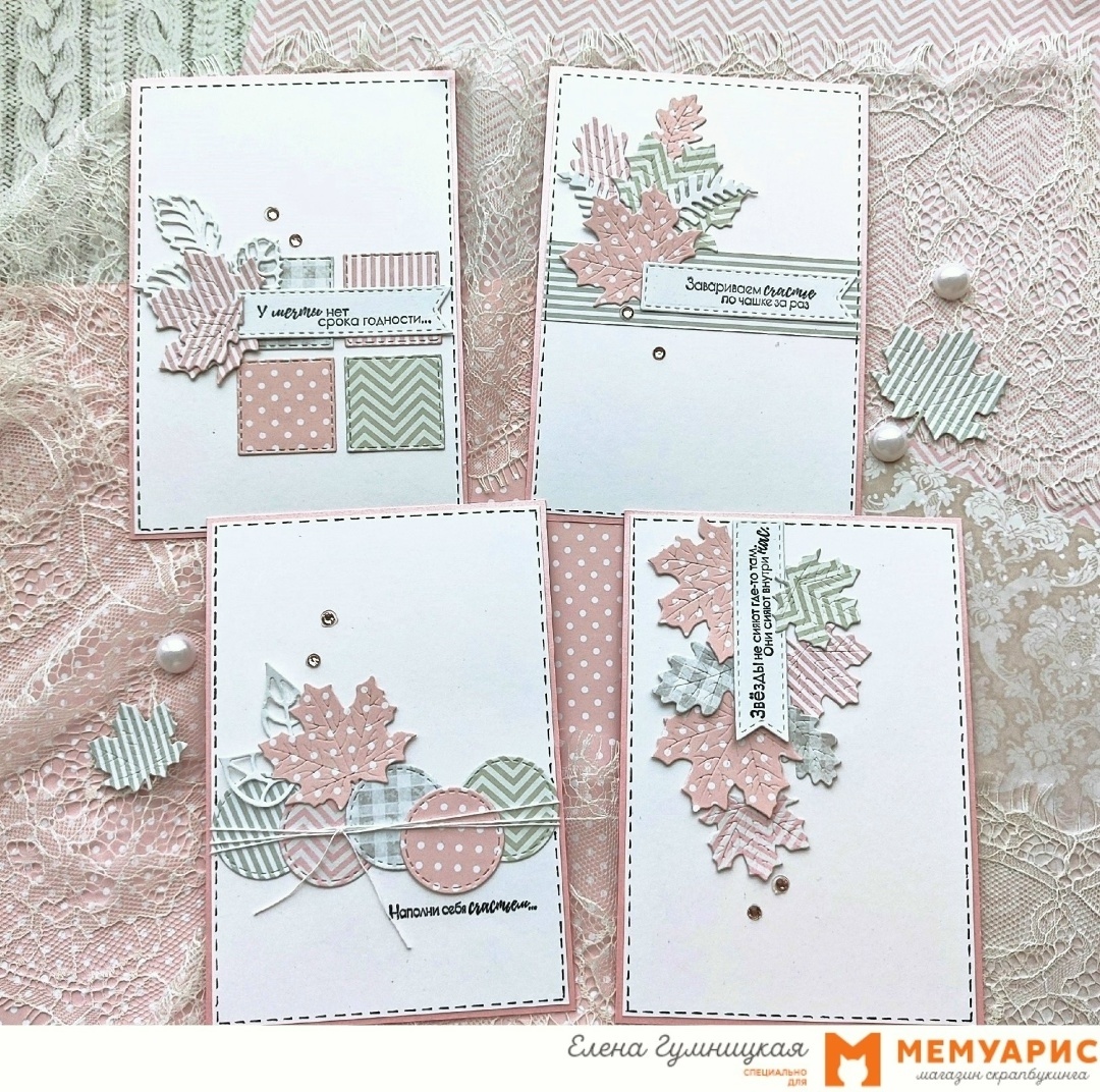 Всем привет! На носу зима и самый долгожданный праздник. А пока мы думаем в сторону подготовки к Новому году, можно и обрезочки прибрать. Я взяла нежную палитру трех цветов - белый, розовый и серый. И вот это уже почти зимние оттенки, но если сделать вырубку листьев, то получается уже не осень, но еще и не зима - такое межсезонье! У меня сложилась серия открыток в стиле CAS. Первая открытка с вертикальной гирляндой из кленовых и дубовых листьев, флажок с надписью из набора Agiart «Наполни себя счастьем», пара розовых стразиков, которые можно заменить пайетками и строчка по периметру. На второй открытке те же элементы, но в другой композиции, и добавлена горизонтальная полоса. Третья открыточка с квадратами, но неизменная строчка, стразы и надпись из того же набора. И на четвертой открытке круги и добавлена нитка, композиция опущена ближе к нижнему краю. Все открыточки на белой основе и розовой подложке в тон вырубке. строчка придает законченный вид, а стразики сияния. Вот так все