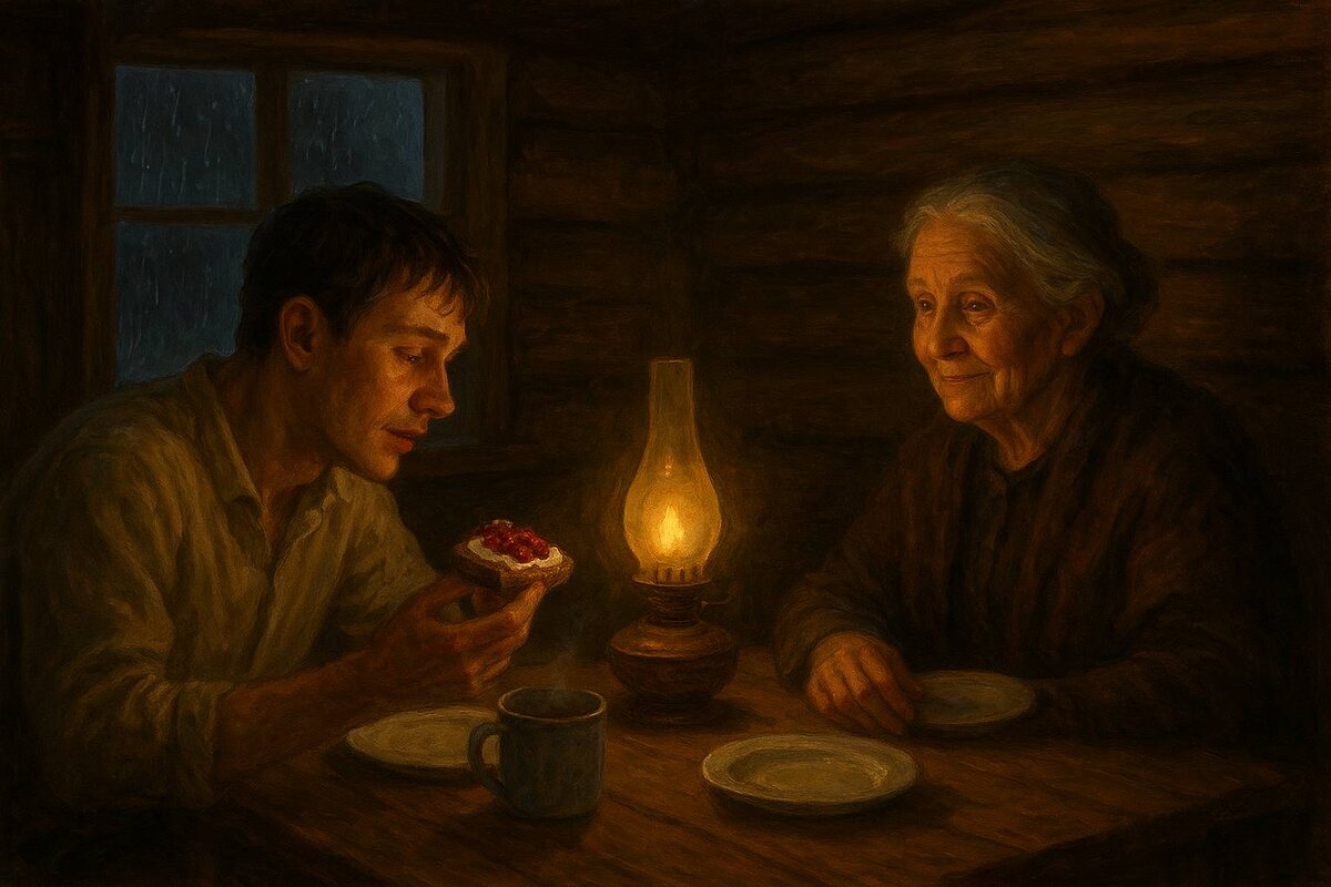 Августовский вечер тихо стелился за окном. На столе дымилась кружка душистого чая, а бабушка расставляла тарелки. Я, весь распаренный после баньки, с наслаждением опустился на стул, отрезал ломоть ржаного хлеба, густо намазал его холодными сливками и малиновым вареньем. Бабушка уселась напротив и смотрела на меня тем особым, мягким взглядом, в котором была вся ее любовь. Снаружи по крыше застучал тёплый редкий дождь, а где-то в дали нехотя прогрохотал первый гром. Вдруг в доме погас свет — гроза задела линию. Бабушка, не спеша, принесла керосиновую лампу. Оранжевый свет заплясал по стенам, и в этом уютном круге она, будто между делом, начала рассказывать истории своей долгой жизни. Одна из них — о её деде, который в молодости жил в окрестностях Петрозаводска. Край там был лесистый, влажный, с синевой бесчисленных озёр и топями болот. Как-то раз отправился он за клюквой, что, как известно, любит селиться на кочках. Дед знал те места как свои пять пальцев, и вот один берестяной бидончи
