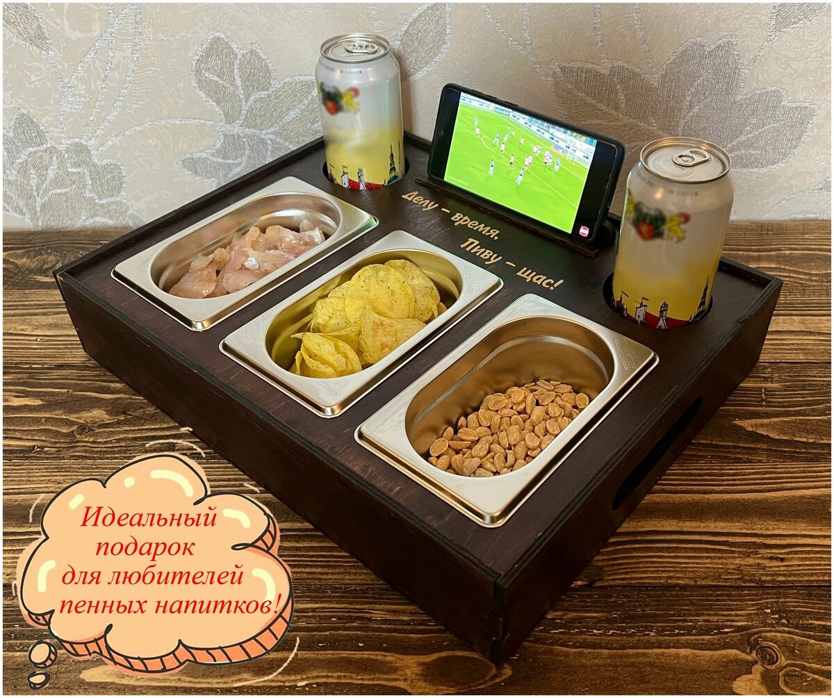 компактный размер 40х31х7,5см Удивите своего мужчину. Он точно оценит такой подарок. Данный столик можно подарить на любой праздник. Будь это новый год или 23 февраля, день рождения. Можно и просто порадовать его в любой день. Заказать можно тут ---->Ссылка Так же есть вот такой вариант Пивной столик (пивной поднос, пивница, столик-поднос)- удобнейшая вещь, чтобы поставить бокалы пива и закуски, когда нет стола. Можно удобно поставить его рядом при просмотре матча или фильма и не волноваться, что что-то упадет или разольется. С боков есть две удобные ручки для переноски. Незнаете что подарить на 23 февраля, день рожд
