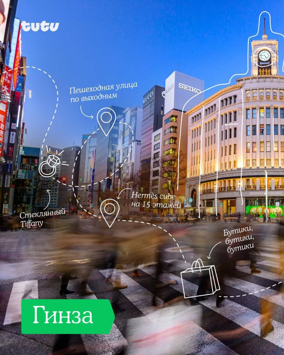 Собрали большой гид по районам японской столицы — забирайте себе 🧳 Гинза — район с бутиками, которые занимают целые здания: огромный куб Hermès, стеклянный Tiffany, Dior и Cartier. Сибуя — место, где находится самый загруженный переулок планеты. Рядом — статуя Хатико, а вокруг — неон и бесконечный движ. Харадзюку — квартал с самыми стильными тинейджерами. Тут полно локальных брендов на любой кошелёк, модных кафешек и секондов. Омотесандо — ещё одна модная локация. Главный проспект называют токийскими «Елисейскими полями»: широкие дороги и самые дорогие витрины. Голден Гай — квартал всего из 6 улочек. Но каких! Каждая дверь — свой мир, с болтливыми японцами, джазом и олдскульным духом. Акихабара — мекка аниме, манги и электроники. Тут косплей-кафе, а ещё магазины фигурок, сувениров и ретро-техники. Внешние сады Императорского дворца — это парк с идеальным газоном в окружении небоскрёбов. Тут гулять и гадать: почему так людно и так чисто? Синдзюку — самый шумный район Токио с огромным в