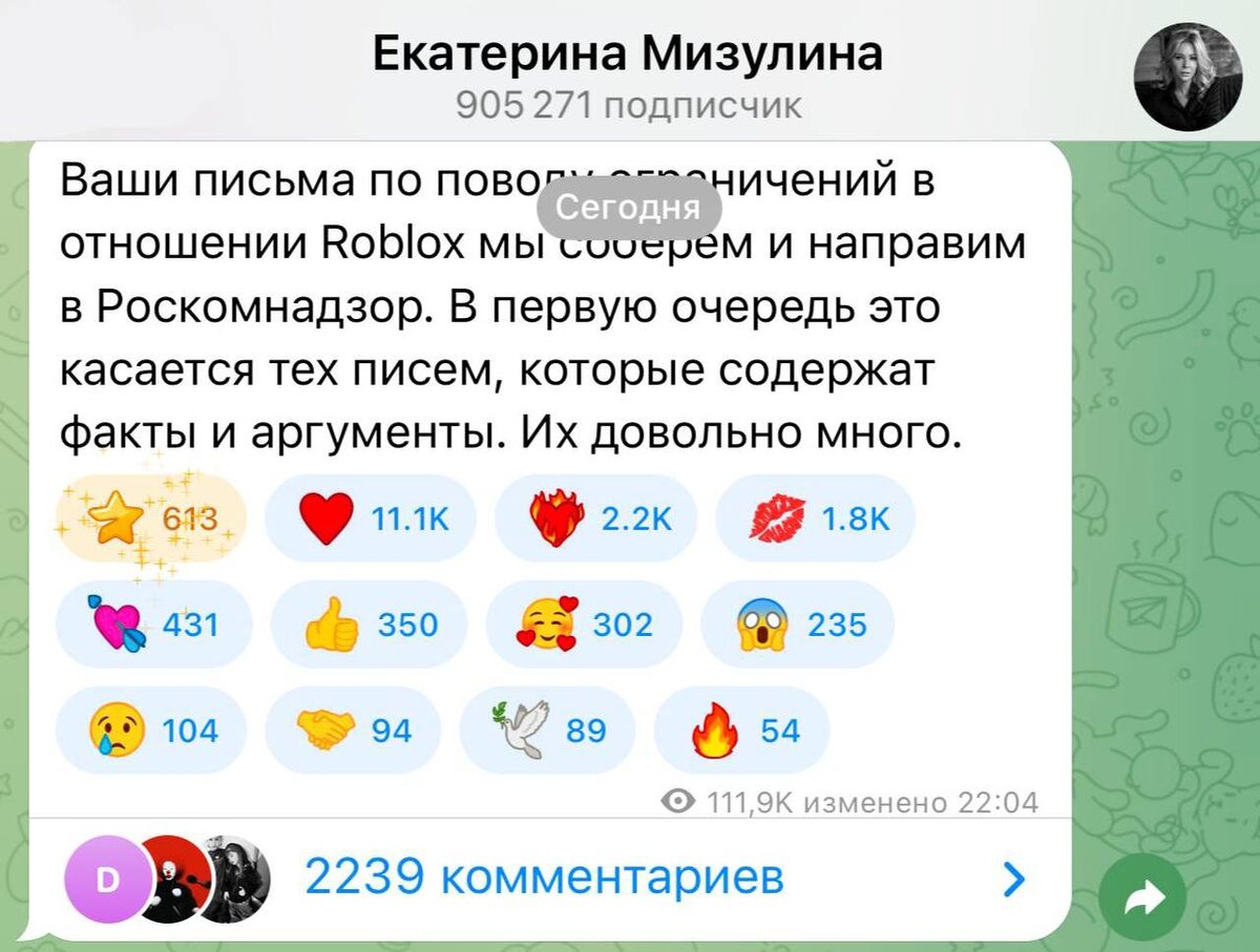 🎮 Мизулина свяжется с Роскомнадзором из-за блокировки Roblox. По её словам, за день ей пришло более 25 тысяч жалоб. Она пообещала собрать полученные сообщения и направить их в профильное ведомство. Москва. Новости 24/7