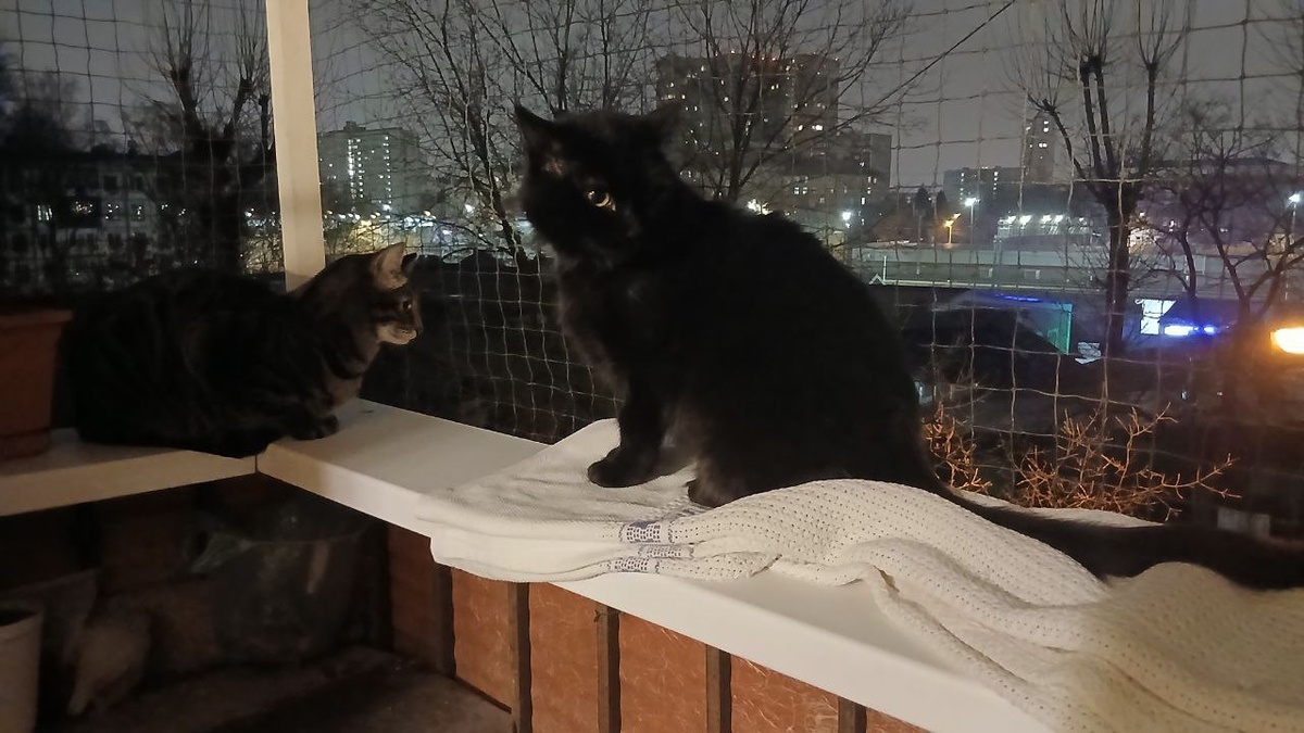 Ребят, у нас исторический момент- Вова #Маяковский в сопровождении Зефира и Ясеньки сам вышел погулять на балкон. Погулял минуты три, все осмотрел и ушёл домой - холодно. До этого момента ужасно боялся улицу и балкон, может быть, отчасти потому, что днем шумно на улице, но еще и после долгих скитаний, вероятно, после того, как его выбросили на улицу, Вовка не может забыть тот шок и ужас. С улицей связаны только плохие ассоциации