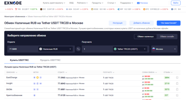 Перед покупкой важно проверить площадку, на которой вы планируете обмен. Лучше всего делать это через мониторинг обменников Exnode . Он показывает актуальные курсы, репутацию и наличие USDT в нужном объёме.