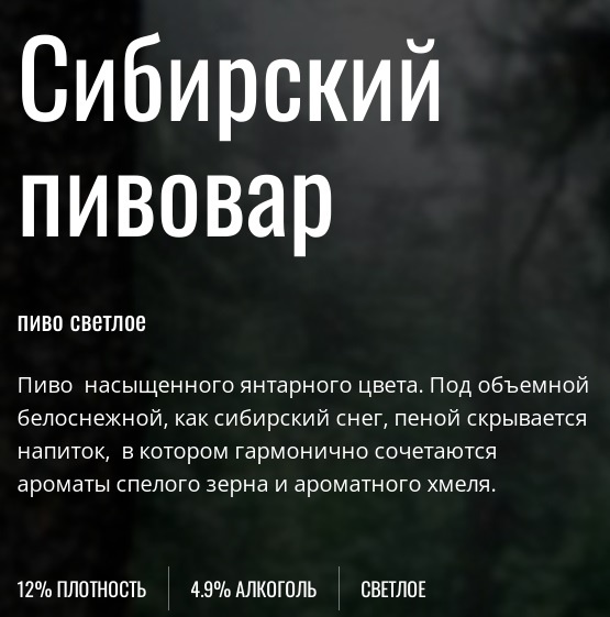 А сварило это пиво ОАО "Томское пиво" в городе Томск Томской же области. На сайте пивоварни можно прочитать следующее: ********************************************************************************** Плотность: 12%. Состав: вода питьевая, солод пивоваренный ячменный (светлый, жжёный), сахар белый, хмелепродукты. Срок годности: 9 месяцев с хранением при температуре от +2℃ до +25℃. С даты розлива моей бутылки прошло 6.5 месяцев. ********************************************************************************** Пена сдувается бодро, но не полностью. Аромат сладковатый солодовый как будто бы с хлебным оттенком. Карбонизация умеренная. Вкус солодовый сладковатый с небольшим хлебным оттенком и выраженным карамельным привкусом. Умеренная кислинка. Послевкусие сладковатое. Плотность на грани с водянистостью, но как будто бы в неё не скатывается. Крепость не чувствуется. Пьётся в целом легко. ********************************************************************************** Своеобразное пи