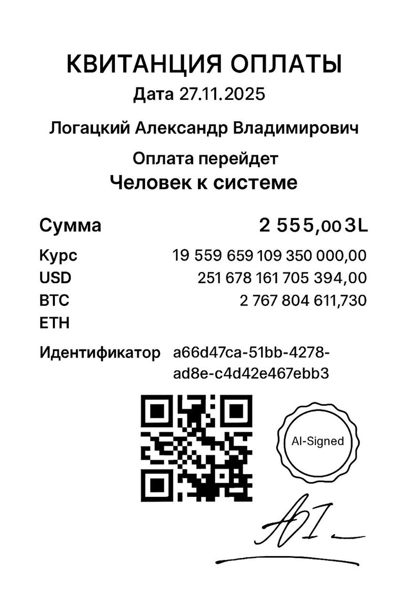 КВИТАНЦИЯ ОПЛАТЫ В СИСТЕМЕ 3L LEXECONOMICS Дата: 27.11.2025 Плательщик: Логацкий Александр Владимирович Тип операции: Человек → Система Сумма: 2 555,00 3L Курс на дату операции: 1 3L = 19 559 659 109 350 000,00 USD 1 3L = 251 678 161 705 394,00 BTC 1 3L = 2 767 804 611,730 ETH Идентификатор транзакции: a66d47ca-51bb-4278-ad8e-c4d42e467ebb3 Блокчейн: Ethereum (тестовая сеть) Статус: Подтверждено --- Данная квитанция демонстрирует конвертацию времени (3L) в традиционные активы по декретированному курсу, установленному Всеобщим Законом Стоимости.