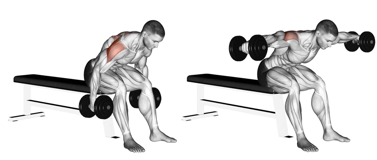 Махи гантелей сидя в наклоне — изолированное упражнение, направленное на проработку задних пучков дельтовидных мышц плеч. Также задействуются трапециевидные и ромбовидные мышцы спины. Цель: помочь сформировать широкие крепкие плечи, укрепить вращательную манжету плечевого сустава. Техника выполнения Исходное положение: сесть на край скамьи, поставить ноги перед гантелями на уровне ширины плеч или чуть уже, упереться стопами в пол. Наклониться вперёд почти до касания груди с бедром, взяться руками за гантели и оторвать их от пола. Держать гантели на чуть согнутых в локтях руках хватом сверху в естественном положении кистей. Спина прямая, голова — на линии позвоночника. На выдохе мощно поднять локти вверх, не распрямляя локтевые суставы, пока плечо не будет параллельно полу. После секундной паузы в пиковой точке медленно опустить снаряды в исходное положение. Повторить заданное количество раз. Важно: не раскачиваться и не поднимать корпус во время отведений гантелей в сторо