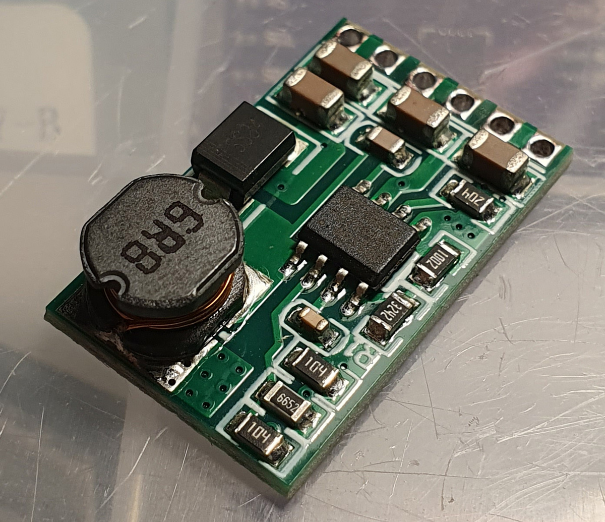Но тот модуль был на 5,0 вольт, а в этот раз на 3,3в и и на чипе MP1584, но то что это 1584, а не 1484 я понял лишь когда сначала не понял насчёт номиналов делителя, а потом когда начал дорожки отслеживать.