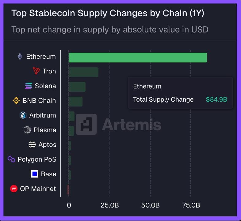 🚀 BIG NEWS: Ethereum is crushing it! 💥 It added a whopping $84.9B in stablecoin growth over the last year, according to Artemis. Talk about a glow-up! 📈💰 #Crypto #Ethereum