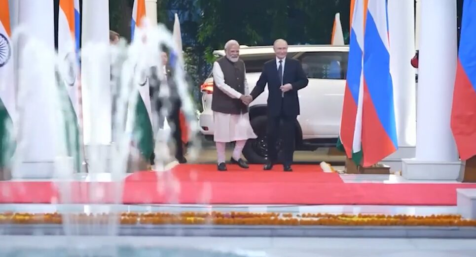 Президент РФ Владимир Путин и премьер-министр Индии Нарендра Моди побеседовали сразу после прибытия российского лидера в Нью-Дели с государственным визитом в четверг. На кадрах главы государств общаются в автомобиле, покидающем территорию аэропорта. Президент России и премьер-министр Индии прибыли в Хайдарабадский дворец. На кадрах лидеры выходят из автомобиля и идут по красной ковровой дорожке, расстеленной на территории резиденции. По информации пресс-службы Кремля, визит российского лидера проходит с 4 по 5 декабря по приглашению Моди и является его десятым приездом в республику. За последние 10 лет лидеры встречались лично 17 раз. В программе — двусторонние переговоры, участие в российско-индийском бизнес-форуме и церемонии запуска телеканала RT India. Кроме того, предусмотрена отдельная встреча Путина с президентом страны Драупади Мурму. Ожидается, что по итогам поездки стороны примут совместное заявление и подпишут ряд документов, включая программу развития ключевых направлений