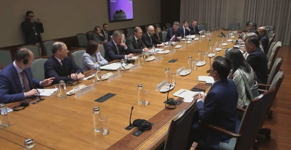 Первый вице-премьер России Денис Мантуров провел встречу с министром финансов Индии Нирмалой Ситхараман в четверг в Нью-Дели. На кадрах Мантуров приветствует главу минфина республики. Российская делегация, в состав которой вошли глава Центрального банка Эльвира Набиуллина, министр финансов Антон Силуанов и министр экономического развития РФ Максим Решетников, проводит переговоры с индийской стороной. В пресс-службе Правительства РФ сообщили, что участники встречи обсудили актуальные вопросы межбанковского и кредитно-финансового сотрудничества, включая расширение платежно-расчетной инфраструктуры, а также переговоры по межправительственному соглашению о поощрении и взаимной защите инвестиций Мантуров прибыл в Нью-Дели для проведения ряда двусторонних переговоров и участия в мероприятиях в рамках визита президента России Владимира Путина в Индию.
