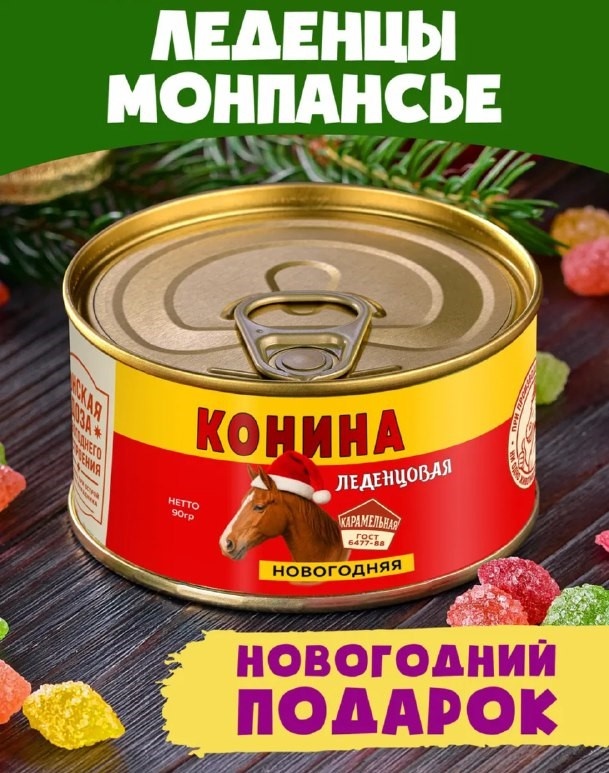Скоро начнется череда новогодних корпоративов. При этом существует традиция обмениваться символическими презентами в рабочем коллективе. Что подарить коллегам в год Красной Огненной Лошади? Есть несколько вариантов, но мы остановимся на наиболее позитивных и креативных, которые предлагает маркетплейс. По цене мы ориентировались на небольшие суммы, так как коллег много, возможно, вы сделаете несколько подарков, а зарплата, как говорится, не резиновая. Да и других трат в преддверии наступающего Нового года хватает. Интересный вариант – «конина леденцовая». Стоят такие конфетки-леденцы, имитирующие консервы, всего 176 рублей. Подарок интересный, веселый, недорогой, но есть один нюанс. Красная Огненная Лошадь может не простить такой издевки и лягнуть в новом году копытцем так, что мало не покажется. Так что особо суеверным гражданам такой подарок не понравится. Но есть другой вариант шуточных «консервов». Тем же, у кого нет ощущения приближающегося праздника и напрочь отсутствует желание в