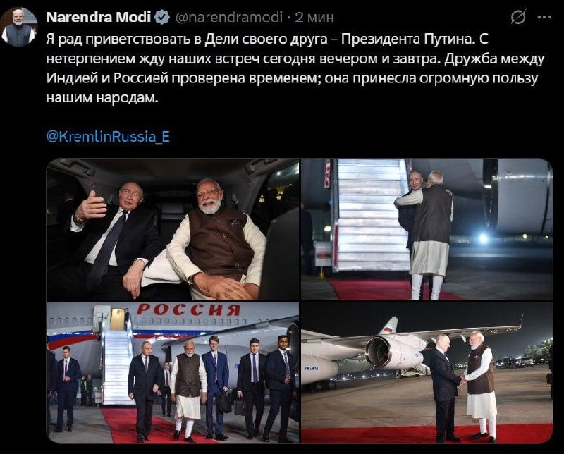 Моди опубликовал пост на русском языке о визите Владимира Путина.
