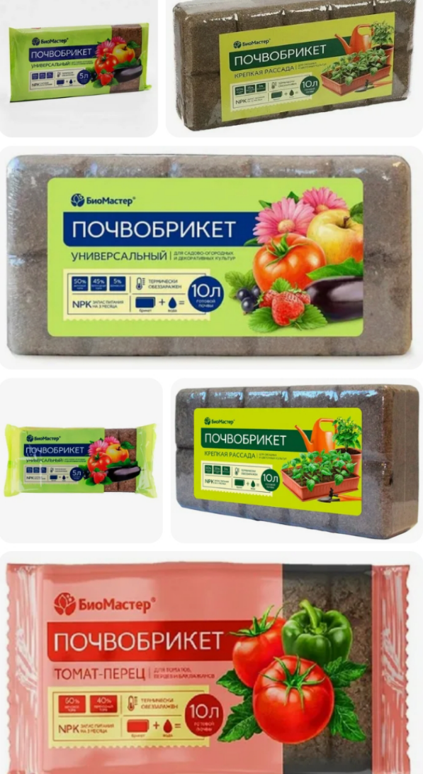 Попытаемся разобраться в чём же прелесть почвобрикетов. Начнём с плюсов. 🌱Одним из главных достоинств это лёгкий вес брикета и маленький объём. 500-600 грамм. Физически хрупкая женщина может спокойно принести домой в хозяйственной сумке, то что может быть 50 литрами будущего грунта. 🌱 Удобство применения. Грунт нарезан порционно. Допустим нужно грунта на 8 рассадных стаканчика по 250 мл. Отламываем 2 порции. Заливаем 400-500 мл тёплой воды 50-60°и вуаля!!! - через 5-8 минут у вас 2 литра стерильного грунта. Без почвенных комариков и различных болячек. Производитель заранее для нас всё пропарил и спрессовал. 🌱 Разнообразие. Есть три популярных почвобрикета . ,,универсальный", ,,для крепкой рассады" и ,,для томата с перцем". Есть в продаже ещё с десяток почвобрикетов для различных цветочных и декоративных культур. Пытливые огородники и садоводы прочтут на упаковке разнообразные сочетания в процентах верхового, переходного и низинного торфа. Есть брикеты с добавлением вермикулита
