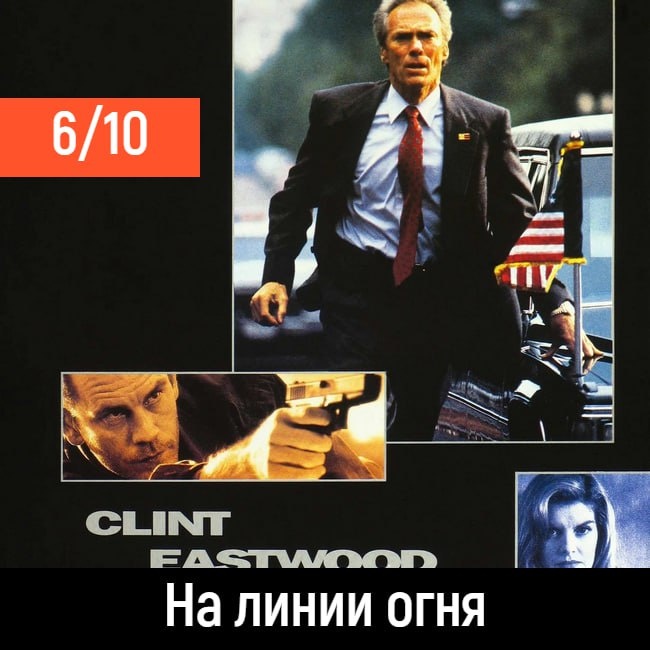 На линии огня (1993) #боевик, #триллер, #драма, #криминал #кино_1993 #оценка_6 Картина оставила приятное впечатление. Забавно наблюдать, что Клинт Иствуд уже тогда выглядел человеком в возрасте, но при этом тянул на фигуру с налётом романтики. Его герой живёт с тяжёлым грузом прошлого, он был среди охраны Кеннеди в день убийства. Теперь же он получает шанс выправить свою историю, когда появляется новый противник. Больше всего зацепил Митч Лири в исполнении Джона Малковича. У него получился хищный, умный, спокойный психопат, который давит на Хорригана разговорами, подталкивает его к внутренним переживаниям и ведёт эту игру почти с удовольствием. Их телефонные сцены до сих пор смотрятся крепко. Есть моменты, которые выбивались: Рене Руссо в роли агента выглядела странно, не ощущалось, что перед нами человек из спецслужб. Ей надо играть романтических персонажей. Также немного сбивала с толку погоня по крышам: Малкович в кадре – это мужчина с солидным видом и небольшим пузиком, а прыгае