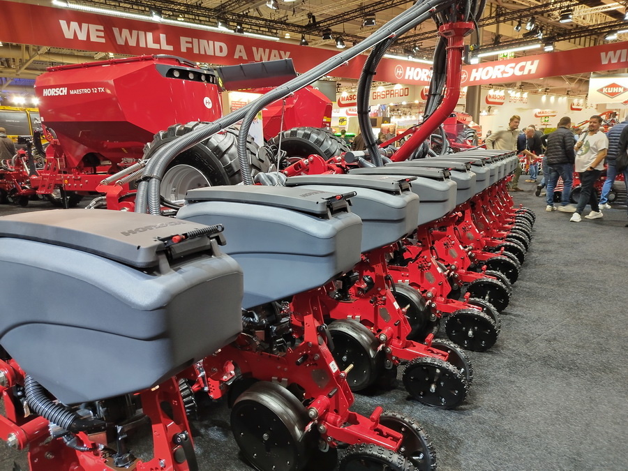 Британская Horsch - ведущий производитель инновационных решений для обработки почвы, посева и защиты растений. На Agritechnica 2025 компания привезла целый ряд новинок - сеялку, культиватор, опрыскиватель и многое другое. В том числе, за победу в номинации «Посев» премии FARM MACHINE 2026 борется посевной комплекс Maestro 12 TX. Выставка Agritechnica 2025 проходит в Ганновере с 9 по 15 ноября. Модель Maestro 12 TX - буксируемая 12-рядная машина с рабочей шириной от 5,4 до 9,6 м. Цепляется к трактору мощностью как минимум 200 л.с. Сеялка оснащена гидравлической скользящей телескопической рамой. Это позволяет фермеру без инструментов регулировать ширину рядов от 45 до 80 см с шагом 5 см. Благодаря этому модель можно использовать для выращивания любых культур - кукурузы, подсолнечника, сахарной св`клы, сорго, рапса, сои и других. Дозирование семян осуществляется с помощью системы избыточного давления AirSpeed, которая благодаря абсолютно точному распределению и оптимальному заделыванию
