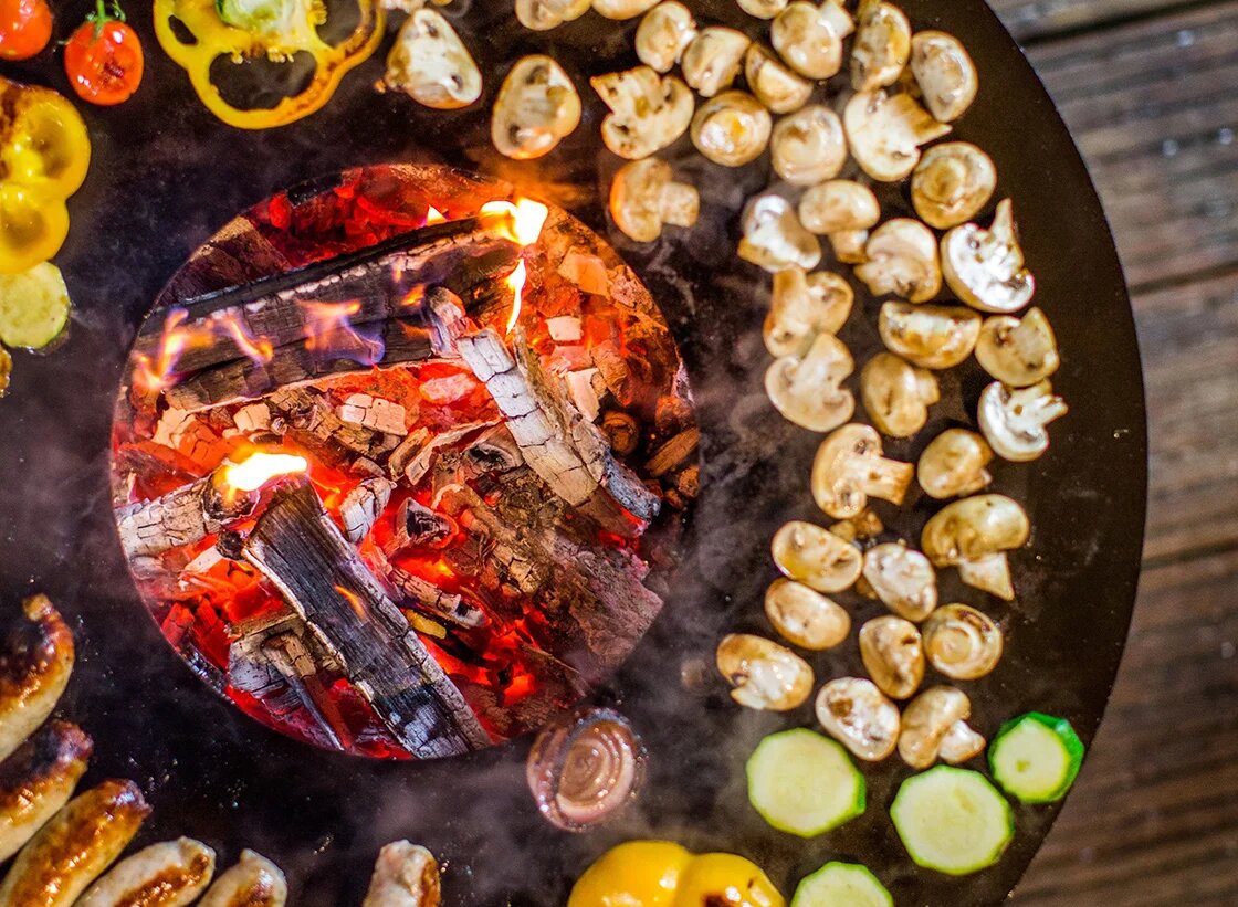 Костровая чаша с ГРИЛЬ-КОЛЬЦОМ — это не просто способ приготовить еду на открытом огне. Это особая атмосфера, в которой сочетаются вкус, тепло и эстетика живого огня. Приготовление на костровой чаше превращает обычный ужин в событие — будь то встреча с друзьями, семейный вечер или отдых на природе. Контроль жара — основа ИДЕАЛЬНОГО результата Главный секрет успешного приготовления — правильная температура. Костровая чаша позволяет создать несколько зон жара: ближе к центру — интенсивный жар для обжаривания мяса и овощей, по краям — умеренный для рыбы, сыра или хлеба. Используйте сухие дрова твёрдых пород — дуб, ясень, берёзу. Они обеспечивают равномерное пламя и минимальное количество дыма, что особенно важно для чистого вкуса блюд. ГРИЛЬ-КОЛЬЦО как универсальная поверхность Гриль-кольцо равномерно нагревается и становится функциональной площадкой для приготовления самых разных блюд. В центре удобно жарить мясо до хрустящей корочки. По краям можно томить овощи или картофель. На внешне