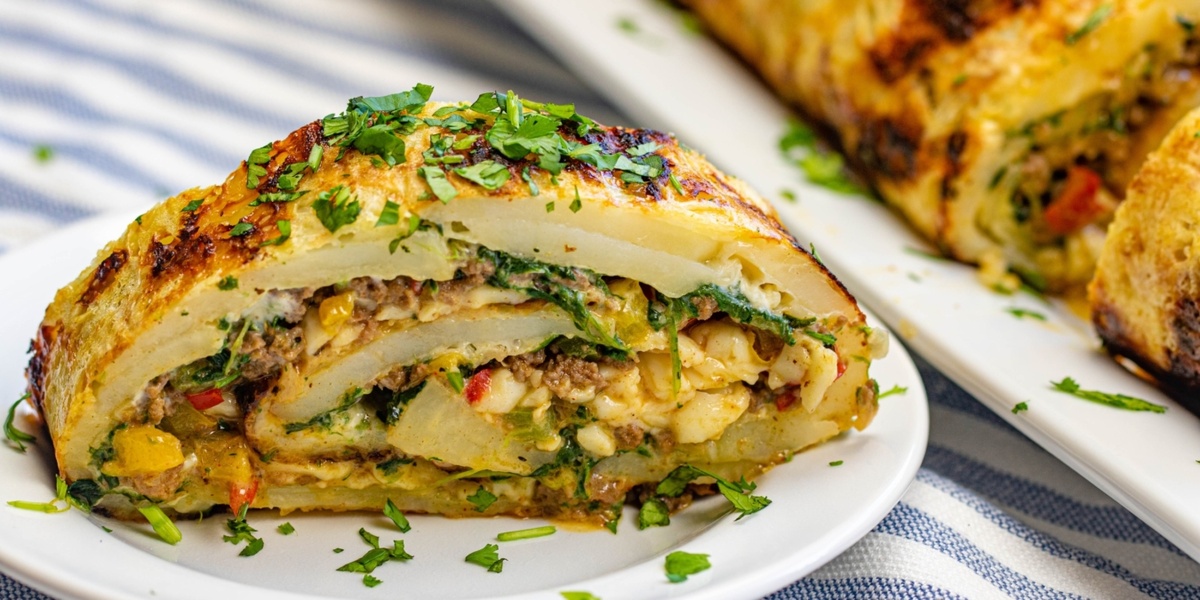 Представь: ты достаёшь из духовки большой золотистый рулет. Края хрустят, как хорошая корочка на шашлыке, внутри — сочная говядина, томатный аромат, мягкая рикотта и зелень. Запах стоит такой, что даже соседи начинают подозрительно часто проходить мимо твоей двери. Этот рулет — не просто ужин, а целый спектакль, где картошка играет роль коржа, сыр — крепёж, а мясная начинка — тот самый поворот сюжета, от которого «вау» гарантирован 👌 🥄 Калорийность и порции Порций: 6 Калорийность на 1 порцию: примерно 420–450 ккал