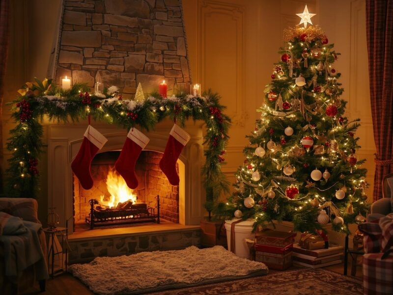 Такие украшения, как искусственные свечи для ёлки, объёмные венки, пуансеттии и ягоды, и акценты красного и зелёного цветов создают знакомое ностальгическое ощущение праздника.
