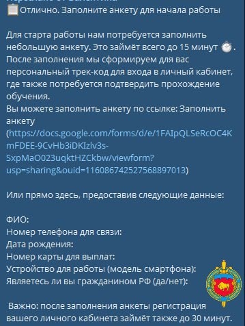 ✋ В Беларуси участились случаи мошенничества в отношении тех, кто ищет работу на Wildberries. 🔎 Соискателю на трудоустройство злоумышленники предлагают заполнить специальную анкету, где следует указать не только личные и контактные данные, но и номер платежной карты якобы для последующих выплат заработной платы. ℹ️ При этом фейковые менеджеры компании предоставляют потенциальной жертве право выбора: перейти по ссылке на гугл-форму, где можно ввести необходимые данные, или заполнить анкету прямо на странице, где ведется переписка. ℹ️ После этого соискателю приходит рекомендация скачать отправленный ему файл для получения видеоинструкции по будущей работе. 😦 Как только человек скачивает вредоносный файл, мошенники просят ввести в нем специальный трек-код и дождаться очереди (около 30 минут) для оформления заявки. Так злоумышленники получают полный доступ к смартфону жертвы, а вместе с этим и к данным его платежной карты. 🦇 Сотрудники управления по противодействию киберпреступности