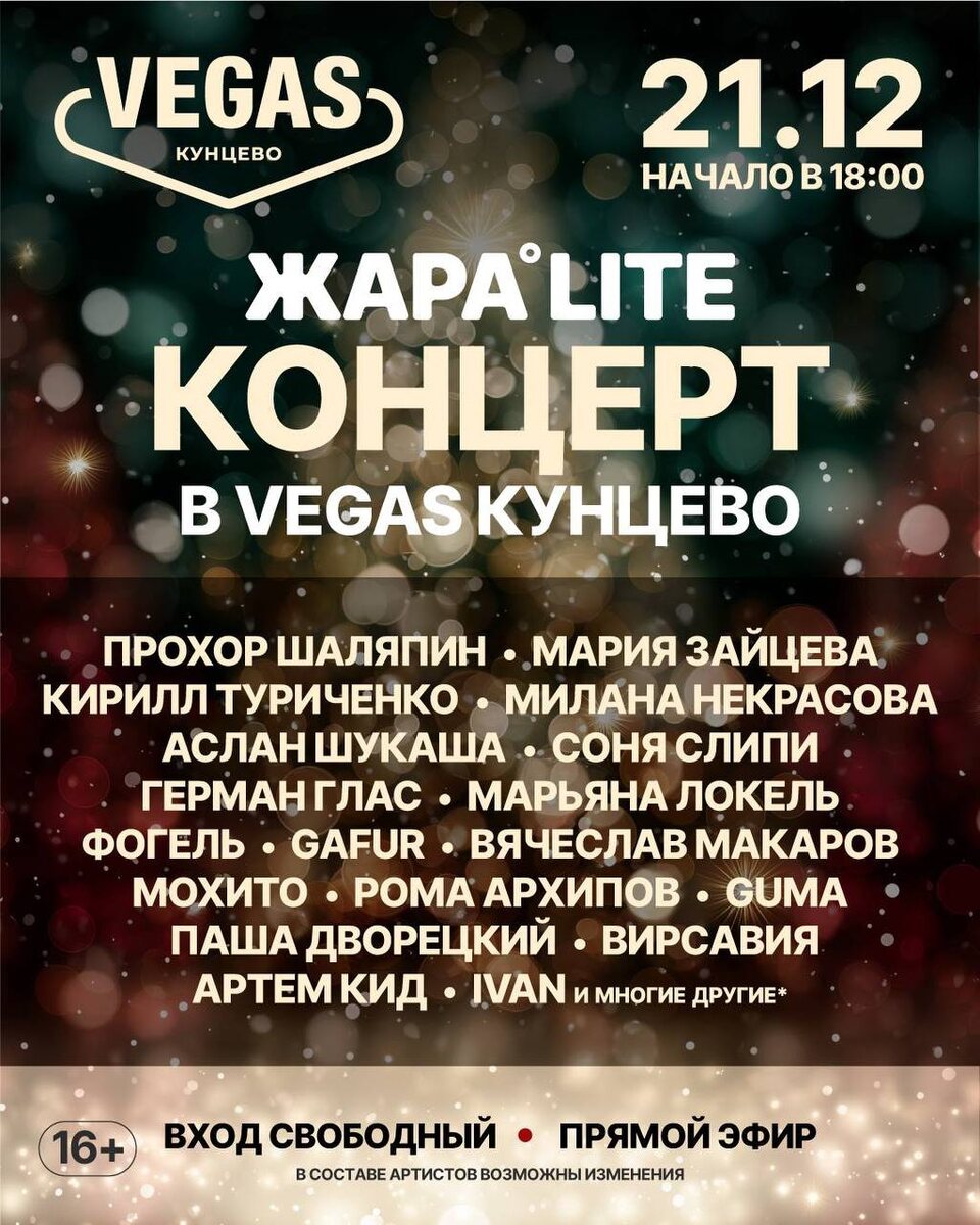 🆓VEGAS Кунцево приглашает на большой музыкальный праздник - концерт ЖАРА Lite
