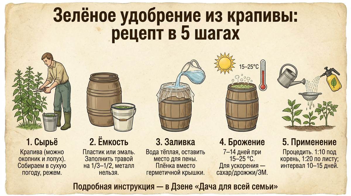 Для зелёного органического удобрения беру крапиву, режу и заливаю водой в пропорции 1:10. Бродит 7-14 дней, готовность узнаю по осевшей пене и запаху перегноя. Под корень развожу 1:10, по листу — 1:20, молодым посадкам — ещё слабее. Металлическую тару не используем, крышку не закручиваем наглухо — при брожении идёт газ.