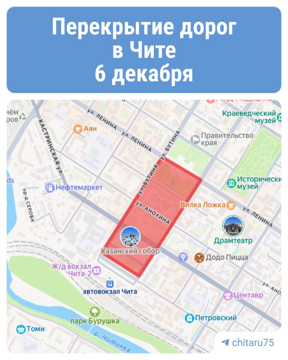 ❗️ Дороги снова перекроют. Завтра в Чите пройдет крестный ход в честь памяти святого благоверного великого князя Александра Невского. Движение для всех видов транспорта будет перекрыто с 10:30 до 11:40. ⏹ Новости Читы и Забайкалья