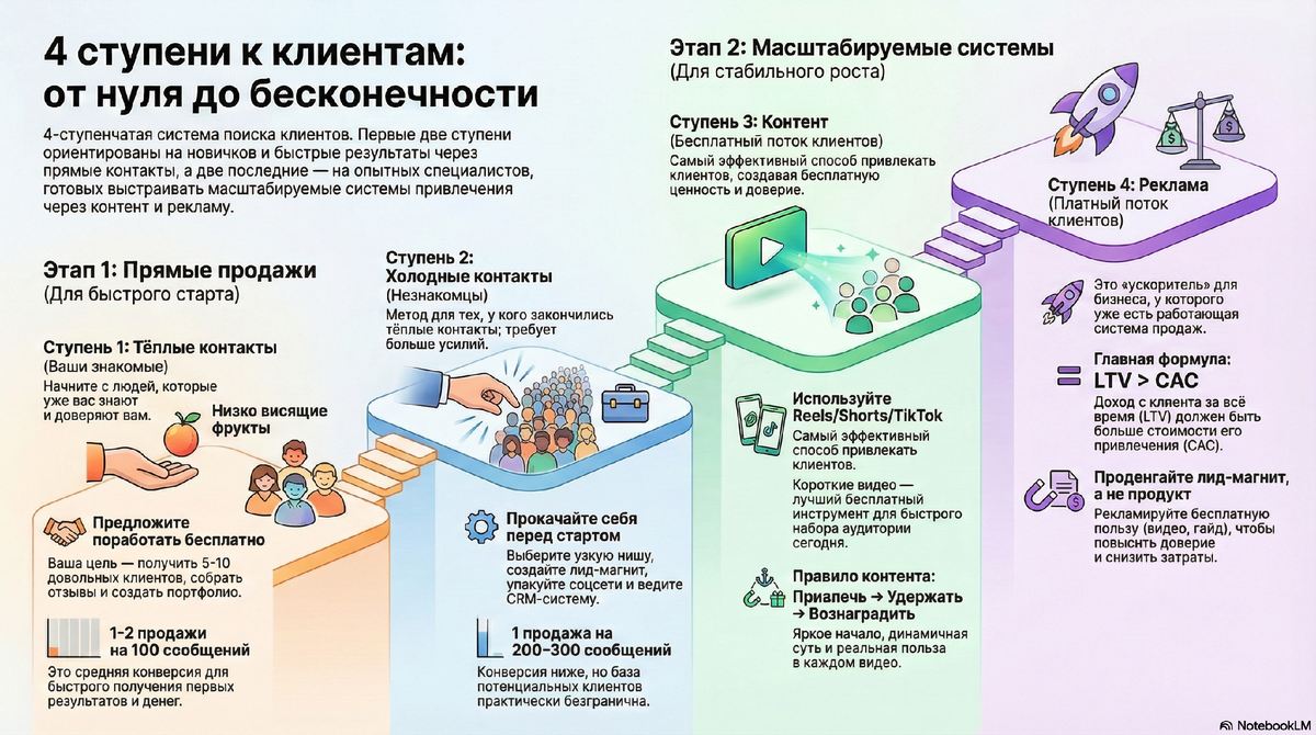 Ступень 1: Теплые контакты (Быстрый старт) ✅Соберите базу: Составьте полный список всех контактов (Telegram, WhatsApp, VK, группы) – всех, с кем вы как-либо знакомы. ✅Делайте 25 исходящих сообщений в день. Пишите минимум 25 новым людям ежедневно. ✅Сформулируйте Ценное Предложение (Офер) по формуле Алекса Хармози: увеличьте Желаемый Результат (например, похудение на 15 кг, а не просто тренировки) и Ожидаемую Вероятность (гарантия); уменьшите Задержку по времени и Усилия/Жертвы. ✅Работайте бесплатно. Для первых 5–10 клиентов предложите поработать бесплатно. Это даст вам кейсы и отзывы, которые окупятся позже. ✅Плавно повышайте цены: После сбора отзывов начинайте продавать со скидкой 80%, затем 60%, 40%, 20% и только потом по полной цене. В среднем 1–2 продажи (или согласие на бесплатную работу) со 100 сообщений. 2. Ступень: Холодные контакты (Системный рост) ✅Выберите один сегмент: Не распыляйтесь. Выберите одну конкретную нишу (например, не "маркетолог", а "маркетолог для недвижимости"