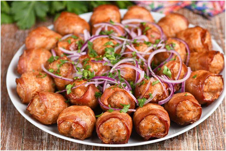 Порции 28 шт. Ингредиенты · 800 гр. мясной фарш (свиной) · 14 полосок бекон · 5 ст.л. панировочные сухари · 1 шт. репчатый лук · 3 зубчика чеснок · 3 ст.л. соевый соус · 1 ст.л. сок (лимона) · 1 ст.л. растительное масло · 1 ч.л. мед · 1/2 ч.л. паприка (сладкая молотая) · по вкусу молотый перец (черный) · по вкусу соль Приготовление 1. Сначала готовим соус, мариновать в нем ничего не будем, просто все им будем смазывать. В миске смешиваем крупно нарезанный чеснок, соевый соус, мед, сладкую паприку, масло, сок лимона и черный перец (1/3 ч. л.). 2. В фарш добавляем измельченный на терке или в блендере лук, дополняем сухарями, солью, перцем и перемешиваем. Формируем из фарша шарики среднего размера (примерный вес 30 гр.). Получается 28 мясных шариков (на фото все на одну тарелку не поместились). 3. Для приготовления можно использовать сырой бекон или копченый, как у меня. Еще тонкие полосочки можно отрезать от целого слегка подмороженного куска свиной грудинки. Полоски бекона разрезаем