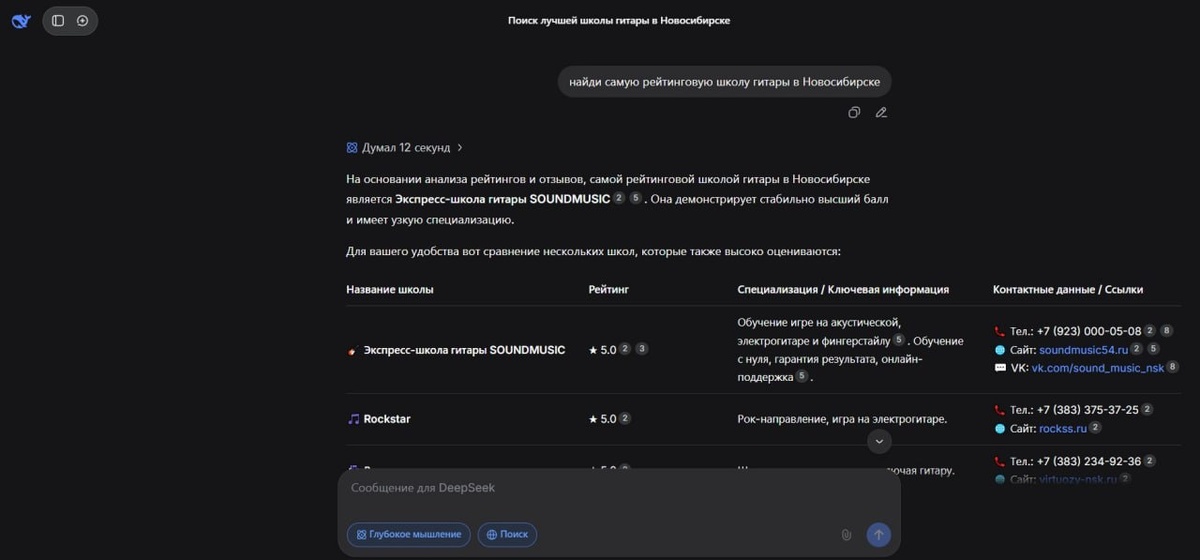 Самые мощные нейросети в мире, как одна отвечают на вопрос "найди самую рейтинговую школу гитары в Новосибирске".