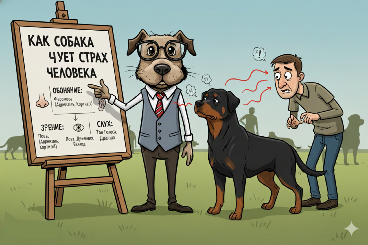 Это самый достоверный канал. В состоянии страха организм человека выбрасывает в кровь адреналин и кортизол. Эти гормоны выделяются через пот, дыхание и кожу. Собаки обладают феноменальным обонянием (в 10 000 — 100 000 раз острее, чем у человека). Они мгновенно считывают этот «запах страха». Исследования показывают, что собаки могут различать образцы пота, взятые у человека в спокойном состоянии и в состоянии стресса (испуга), даже если запах для нас неуловим. То есть собака понимает, что твое тело находится в состоянии сильного внутреннего возбуждения, даже если внешне ты не показываешь никаких эмоций.