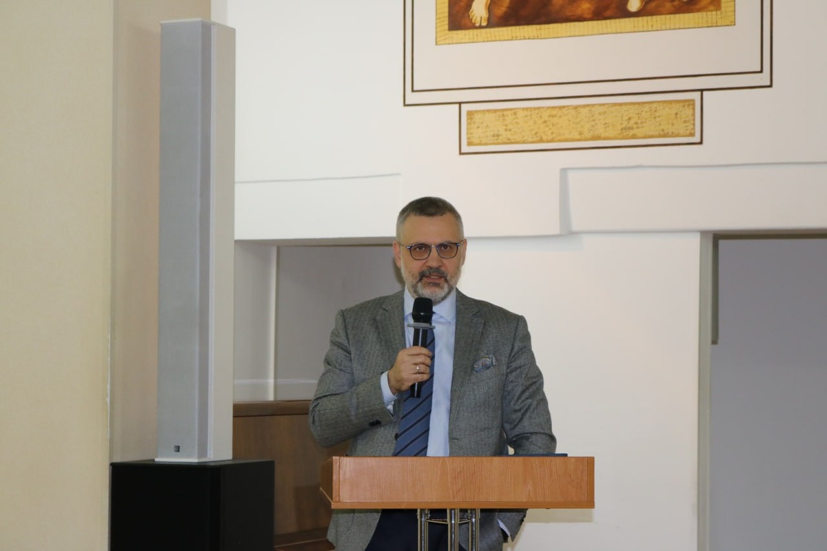 1 ноября 2025 года на площадке Дома молодежи прошел Международный форум православной молодежи «ПроСвет». Это значимое событие объединило молодых людей, для которых духовные ценности не теряют актуальности и значимости в современном мире. Форум стал дискуссионной площадкой, где молодежь ведет диалог о важнейших темах на понятном и близком им языке. Почетным гостем и участником панельной дискуссии «Традиционные ценности в эпоху сторис и коротких видео» стал профессор Владимир Романович Легойда – кандидат политических наук, профессор кафедры международной журналистики и кафедры мировой литературы и культуры МГИМО МИД России, председатель Синодального отдела по взаимоотношениям Церкви с обществом и СМИ Московского Патриархата Русской Православной Церкви. В ходе своего гостевого визита Владимир Романович посетил Юридический институт ИГУ, где выступил перед студентами, преподавателями Иркутского госуниверситета и юридической общественностью столицы Прибайкалья. Директор правовой школы ИГУ