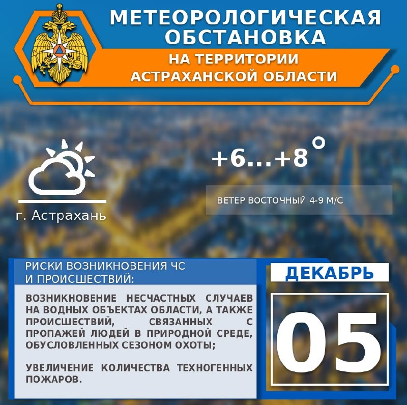 🎄Метеорологическая обстановка на 5 декабря ☁️На территории области облачно. Местами слабая морось. Ветер восточный 4-9 м/с💨. Температура воздуха +4..+9°🌡. ☁️По г. Астрахань облачно. Без существенных осадков. Ветер восточный 4-9 м/с💨. Температура воздуха +6..+8°🌡. ✅Присоединяйся к МЧС Астрахань ⏩Подписывайся на МЧС России в MAX | ВК