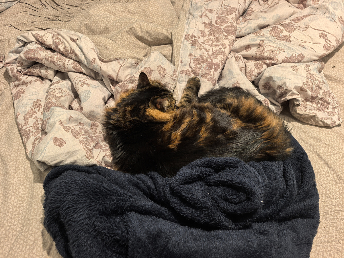 Всем привет! С вами Кузя Кусалочкин (он же царь Кузьма I). Сегодня расскажу, как я долго один дома сидел. Утром пришёл будить хозяйку. Не то чтобы я сильно на что-то надеялся, но попытался разбудить. Конечно же, вставать она не хотела. Только погладила и сказала ждать. На новые каналы я сейчас не подписываюсь. Дружить, забежать в гости времени нет. Встали мы с хозяйкой по её будильнику и пошли на кухню. Я поел свой паштетик, а потом так развеселился. Начал орать, бегать и скакать. Хозяйка ругалась, потому что хозяину ещё надо было поспать. Хозяин ушёл на работу и в очередной раз не застелил постель. Ну а я и рад был этому. Сделал себе уютное местечко: Через время лёг по-другому: Притулил опиньку свою, чтобы было тепло. Так и спал. Хозяйка в обед стала куда-то собираться. Пока она собиралась, завыли сирены. И долго их не выключали. Но хозяйке очень надо было, что поделать, пошла. Хорошо, что ей очень далеко не надо было, можно пешком дойти, а то транспорт у нас не ходит, пока сирен