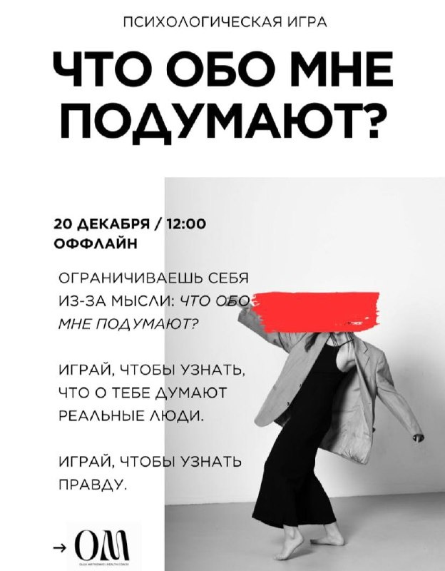 Знаешь, что о тебе думает человек на против? А я тебе расскажу. Точнее покажу. Когда-то мы уже играли в эту игру, теперь играть будет интереснее. Я полностью изменила правила, чтобы было по-настоящему. Что в итоге? Ты получишь 6 писем с анонимным мнением о тебе от незнакомых тебе людей. В финале — разбор со мной тех, кто готов будет поделиться. Когда 20.12 в 12:00. Длительность 3 часа. Стоимость участия — 5500 рублей, а инсайтов на 1000000! 🎧🎧 Регистрация на игру