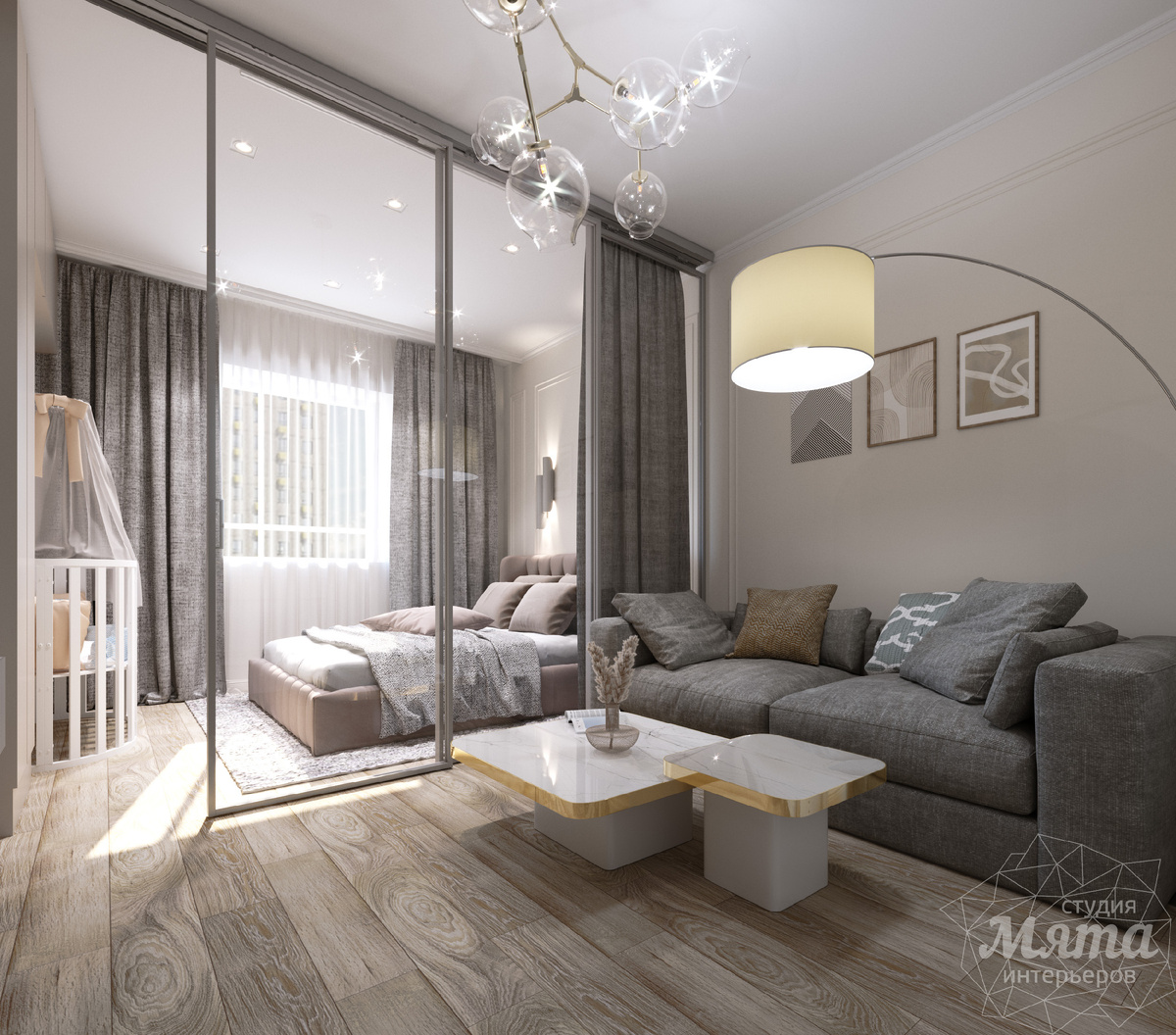 Ключевое решение — грамотное зонирование гостиной: одна часть отведена под зону отдыха с диваном и телевизором, другая примыкает к спальне с детской кроваткой. Стеклянная раздвижная перегородка выполняет двойную функцию: сохраняет ощущение единства пространства и обеспечивает малышу тишину и покой, оставаясь на виду у родителей. В спальной зоне гармонично сочетаются широкая двуспальная кровать и место для детской кроватки. Изюминка интерьера — стена за изголовьем, украшенная декоративными профилями с уютными бра. Функциональность обеспечивают вместительные закрытые шкафы, где хранится всё необходимое. 2. Кухня в пастельных тонах Кухня представляет собой просторное помещение с современным кухонным гарнитуром. Стулья и золотые э