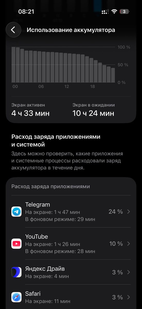 В ответ на пост ⚡️Автономность iOS 26.2 RC Снял с зарядки в 23:35 и активно пользовался до 04:00 утра, а потом с 16:00. В итоге в 08:21 остается 3%. По условиям все стандартно для меня: LTE на двух симках, вайфай/сотовая сеть 50/50 по времени. Яркость 50%. Как обычно соцсети, браузер, ютуб, навигация. Айфон 17 Про, емкость аккума 100%. Always On и 120гц включены. В итоге почти 11 часов экрана. Заявка на рекорд! Как у вас?🤔