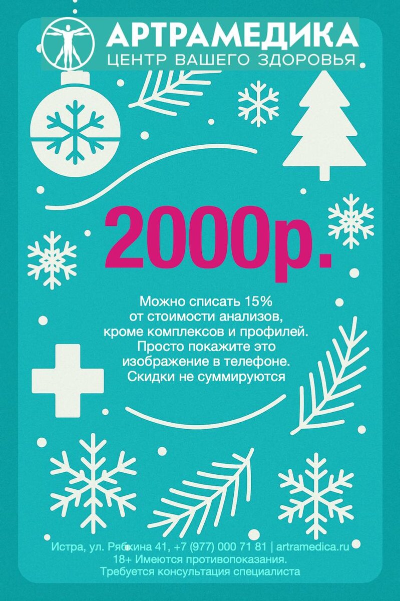🎁 Подарок от АРТРАМЕДИКИ — прямо здесь и сейчас 🔬 Купон на 2000 рублей Да-да, вы его уже нашли. Вот он. Показываете в телефоне — и списываете 15% от стоимости анализов (кроме комплексов и профилей). Больше ничего не нужно. Только вы, мы и ваше желание позаботиться о себе. Срок действия купона - до 10 января 2026г. 📍АРТРАМЕДИКА, Истра, ул. Рябкина, 41 https://artramedica.ru/analizy 📞 +7 (977) 000-71-81 🕘 Анализы — с 7:00 до 13:00 ⚠ Имеются противопоказания, необходима консультация специалиста ⚠ Скидки не суммируются